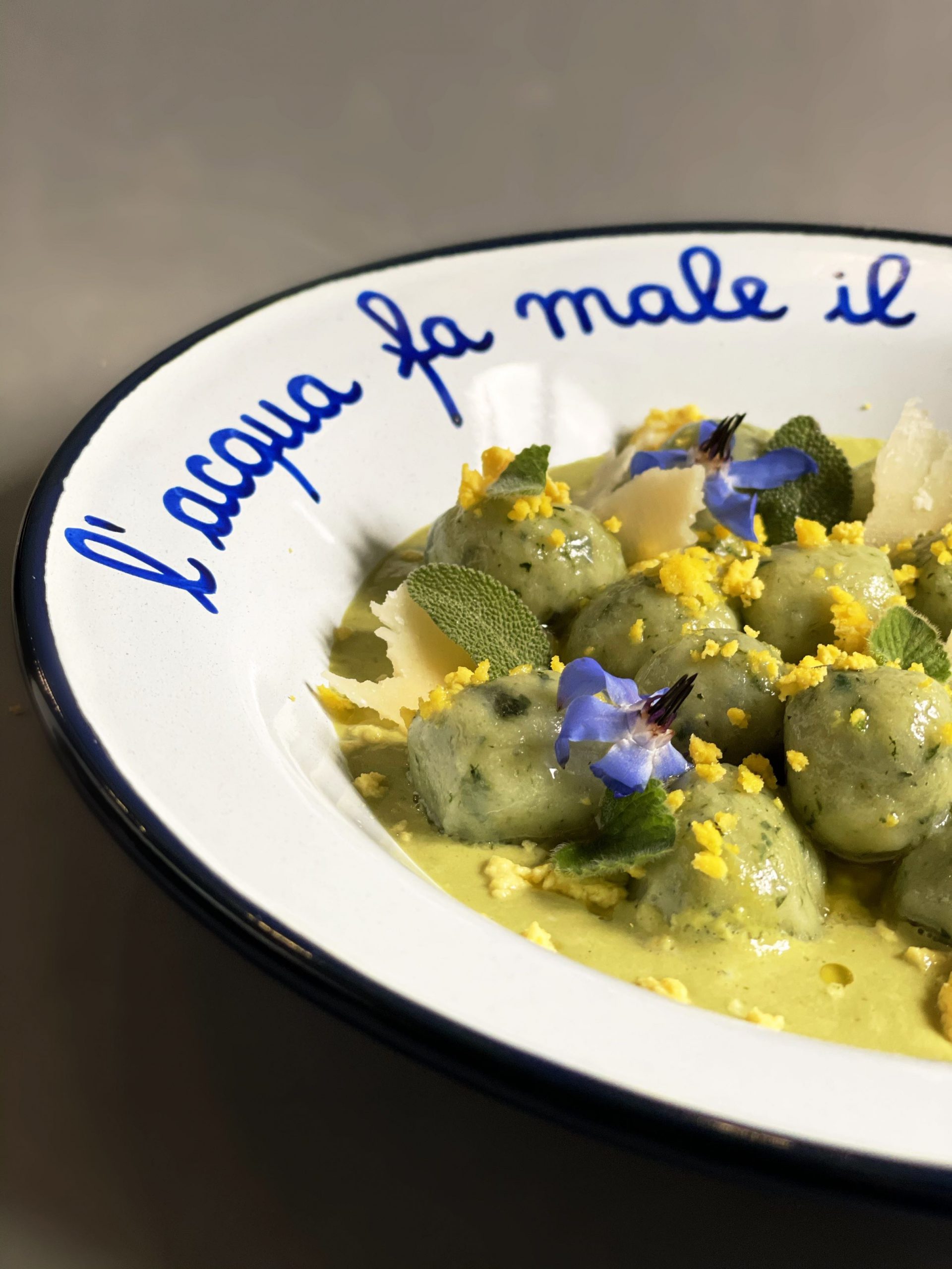 Gnocchi di patate con borragine, saltati con burro chiarificato, salvia e mentuccia… salsa agli asparagi, tuorlo d’uovo sbriciolato e grana